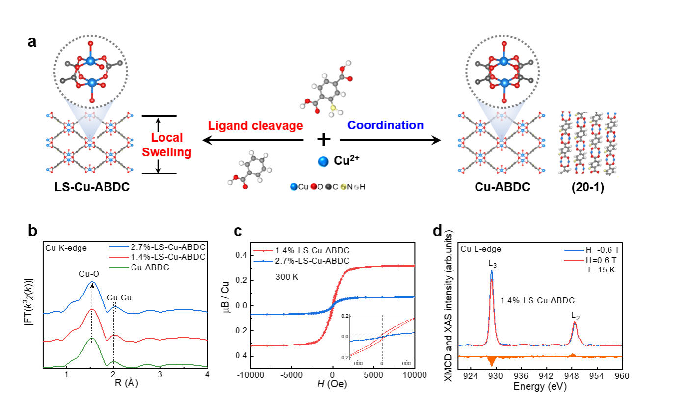 图2(a)Cu-MOFs的合成过程示意图,(b)Cu-MOFs的EXAFS谱图,(c)300K的磁滞回线谱图,(d)Cu的磁圆二色信号图。