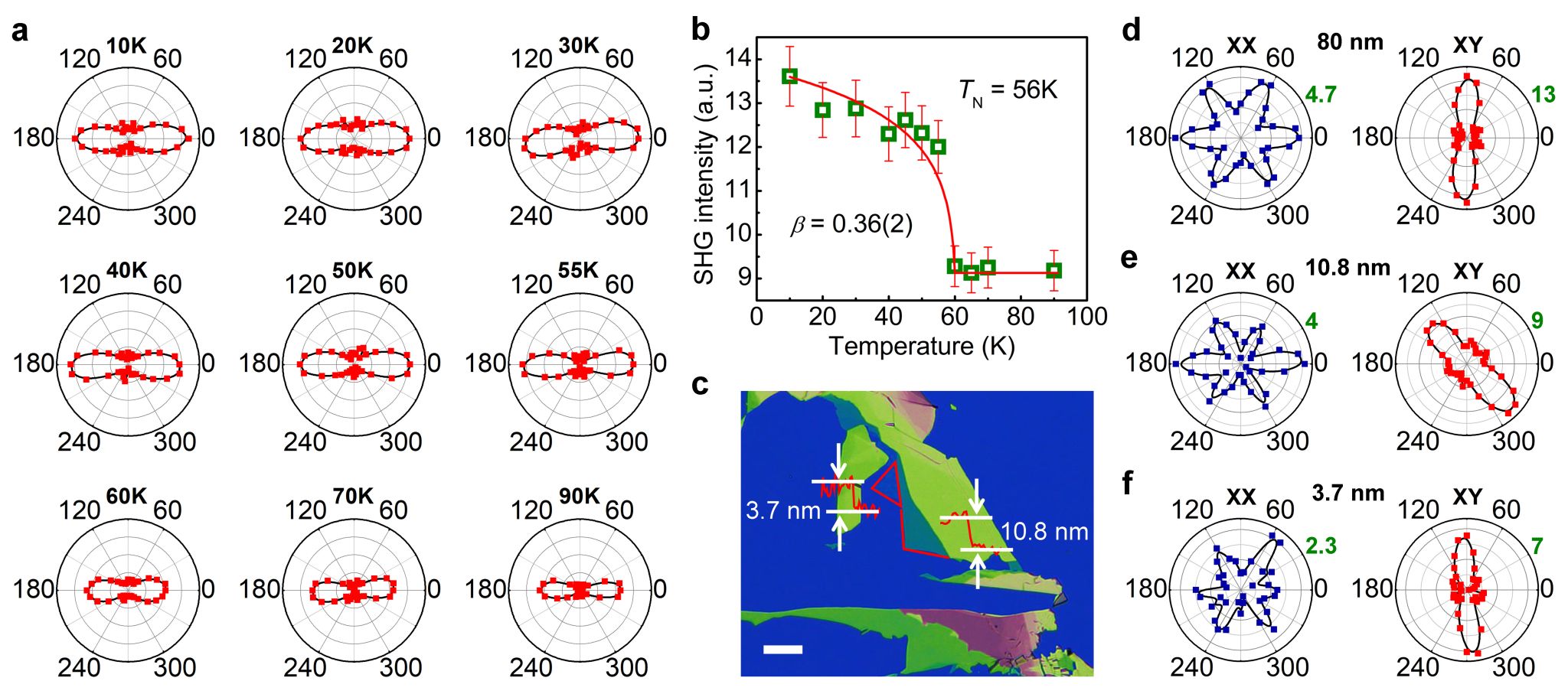图1(a)温度依赖的SHG图形,(b)提取的SHG强度拟合,(c)解理的VPS3光学照片,(d-f)不同厚度VPS3样品的SHG图形。