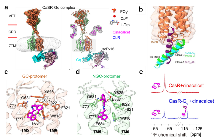 团队结合冷冻电镜与NMR技术,首次揭示了正向别构调节药物分子cinacalcet在受体信号复合物中的多样结合模式:cinacalcet以伸展(extended)和弯曲(bent)两种不同的构象,分别结合在二聚体CaSR受体的两个跨膜结构域的胞外侧结合口袋中,其中只有结弯曲-cinacalcet的跨膜结构域的胞内能够偶联下游信号蛋白Gq。和其他GPCR(包括A家族、B家族、C家族等)类似,CaSR仅结合一个下游信号蛋白,且CaSR-Gq复合物整体处于非对称构象,而且受体的局部跨膜结构域也处于非对称构象,cinacalcet以两个完全不同的构象结合在两个跨膜结构域中。同时,CaSR单独受体(不含Gq蛋白)与cinacalcet的三维结构表明,尽管cinacalcet在两个跨膜结构域中都处于bent构象,但是CaSR受体本身仍然是处于非对称构象。