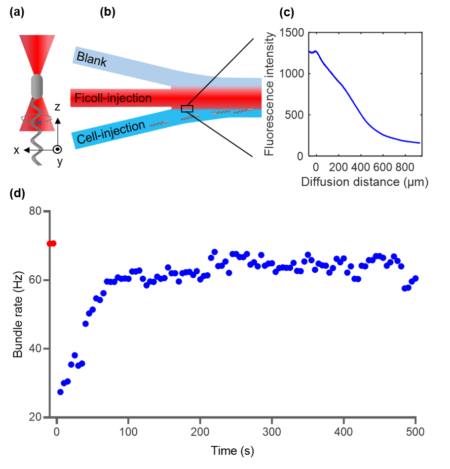 图2.微流控实验。(a)光镊抓住细菌。(b-c)微流管道形成界限分明的不同粘度的沟道,通过光镊移动细菌能迅速改变细菌的液体环境。(d)当细菌外界液体粘度突然增加时,鞭毛束转速随时间的变化。红色数据点代表低粘度下的转速,蓝色数据点代表粘度在零时刻突然增加时,转速的变化。