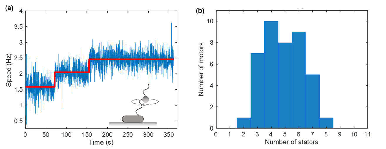 图1.(a)马达复活实验。在零时刻突然增加马达负载,发现马达转速一步一步增加,说明初始时马达定子数未满。(b)实验测量的细菌在自由液体环境游动时,鞭毛马达内定子数统计分布,发现平均定子数为满态(11个)的一半。