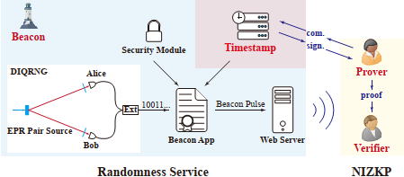 在该工作中,研究团队搭建了一个基于DIQRNG的信标公共服务系统,并利用该系统设计并实施了一种不依赖于真随机数假设的NIZKP方案。该随机数信标服务可以实时向公众广播生成的随机数。此外,为确保随机数在广播过程中的安全性,研究团队采用了可以抵御量子攻击的量子安全签名算法。随后,研究团队利用接收到的来自DIQRNG的随机数代替之前的伪随机数,构建并实验验证了更安全的NIZKP协议。