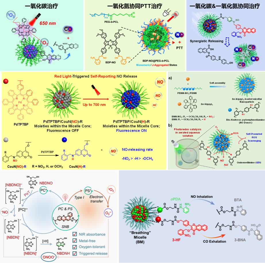 气体递质一氧化氮(NO)、一氧化碳(CO)和硫化氢(H2S)在生物体内的重要作用促使多种外源性供体分子及载体的设计和制备。和传统药物分子不同,以气体的方式直接吸入给药治疗需要严格控制剂量,而吸入后的气体递质快速代谢,较难到达病灶位置。由可控触发方式激活供体分子释放,可以优化气体递质的药代动力学及降低生物毒性,实现气体递质在生物体内的良好生物学效应。中国科学技术大学化学与材料科学学院高分子科学与工程系胡进明课题组在气体递质载体的构筑和可控释放方面展开了系列工作,实现了在不同波长光触发下气体递质的可控释放,探索了气体递质在抗炎、抗菌、抗生物膜感染和治疗关节炎、促进伤口修复等方面的功能应用(Angew. Chem. Int. Ed. 2023,62, e202219153; ACS Nano 2022, 16, 20376; Angew. Chem. Int. Ed. 2022,61, e202204526; Angew. Chem. Int. Ed. 2022,61, e202207250; Adv. Drug Deliver. Rev. 2021, 179, 114005; Angew. Chem. Int. Ed. 2021,60, e202112782;Angew. Chem. Int. Ed. 2021,60, 20452;Angew. Chem. Int. Ed. 2021,60, 13513;Angew. Chem. Int. Ed. 2020,59, 21864;图1)。