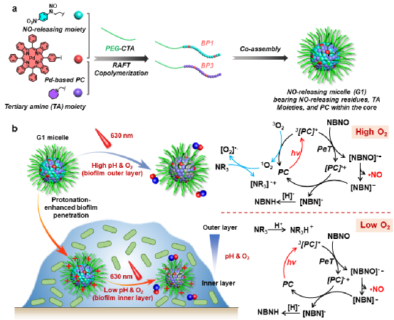 图2.含有叔胺和一氧化氮供体的聚合物共组装制备纳米胶束,通过两种不同的光氧化还原催化机制释放一氧化氮。