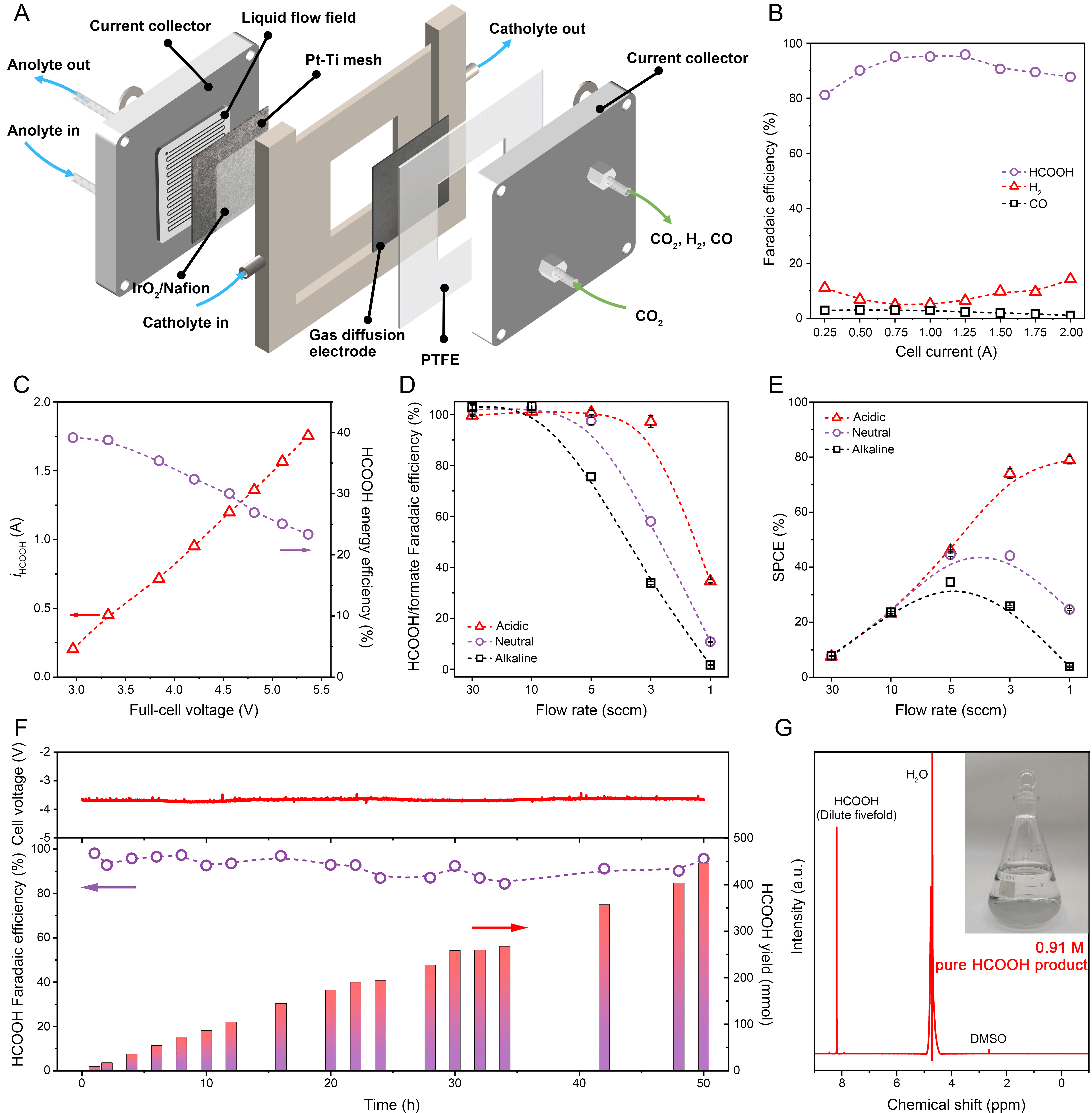 最后,研究人员在超薄流动电解槽中测试“储液池”催化剂的二氧化碳转化性能。在电流为1.25 A时,“储液池”催化剂的甲酸法拉第效率达到95.8%;在槽压为?2.96 V时,甲酸全电池能量效率达到~40%,单程转化效率可达79%(图4)。通过在0.5 A电流下稳定电解50小时,研究人员最终电合成了360 mL纯度为4.2重量%(0.91 M)的甲酸水溶液。