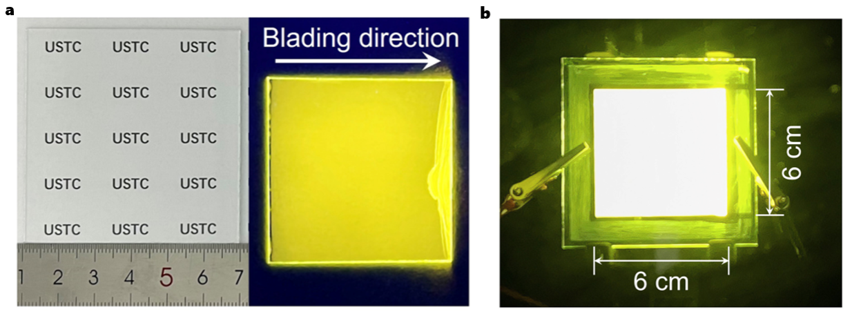 鉴于此,课题组基于铜碘杂化团簇体系设计和制备了一类可用于溶液加工的宽光谱发射杂化团簇并成功构建了高性能暖白光LED器件(图1)。通过同时引入氮膦螯合配体和高自由度的含膦增溶配体对铜碘团簇进行修饰,得到了兼具高发光效率和高溶解度的铜碘杂化团簇,该团簇在LED器件制备所使用的交叉溶剂N,N-二甲基甲酰胺(DMF)中表现出超过200mg/mL的高溶解度和良好的结构稳定性。使用铜碘团簇/DMF溶液进行旋涂制备得到的发光薄膜具有0.22 nm的低表面粗糙度和超过70%的高发光量子产率,将其直接作为发光层,能够通过正交溶剂路线制备低成本的暖白光LED器件。所得器件最大外量子效率达到19.1%,亮度超过40000 cd m-2,并且工作寿命超过232小时(T50@100 cd m-2)。与此同时,得益于团簇良好的溶液加工性能,研究成员通过大规模刮涂技术,构筑了工作面积为36 cm2的大尺寸溶液法LED器件,该器件展现出亮度接近60000 cd m-2的暖白光发射(图2)。此外,通过在氮膦螯合配体的氮杂环上修饰不同的供电子基团,课题组展示了一系列发光颜色可调的溶液法LED器件(图3)。该研究工作实现了基于铜碘杂化团簇材料的高效、高亮度暖白光LED器件的构筑,铜碘杂化团簇材料体系所具备的结构可拓展性以及光谱可调节性使其在低成本高性能LED面板等固态照明技术中展现出巨大的潜力。