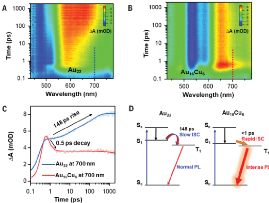 通过瞬态吸收光谱进一步研究其激发态动力学发现,两种团簇的发光态均来自于三重激发态(T1),且在飞秒瞬态吸收光谱中观察到了不同的动力学过程。在380nm激发下,Au22表现出148 ps的上升过程,而Au16Cu6表现出0.5ps的快速下降过程。通过三重态敏化实验证明,这两个过程可以归属于S1→T1的系间窜跃(ISC)。由于铜掺杂使得Au16Cu6具有更小的?EST,因此显著加快了其ISC的速率,最终Au16Cu6展现出接近100%的PLQY。