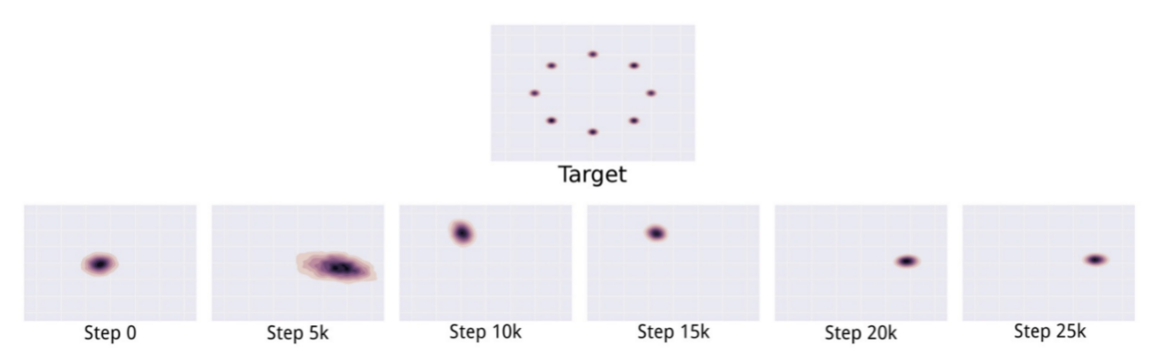 经过深入研究,研究团队发现了生成对抗网络产生模式崩溃的根本机理。理论分析表明,当真实数据存在多个模式时,生成器损失函数关于其参数是非凸的。具体地,导致生成分布仅覆盖真实分布的部分模式的参数,是生成器损失函数的局部极小点。