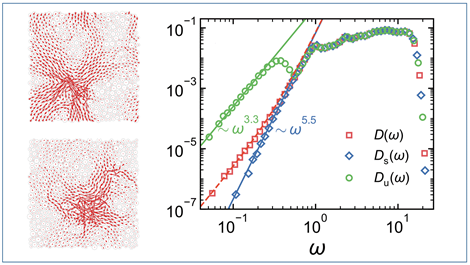 图1.二维不稳定(左上图)和稳定(左下图)非晶固体的最低频本征振动模式及相对应的本征振动模式态密度(右图)。其中Ds(ω)、Du(ω)和D(ω)分别为稳定固体、不稳定固体以及它们加权平均的态密度。