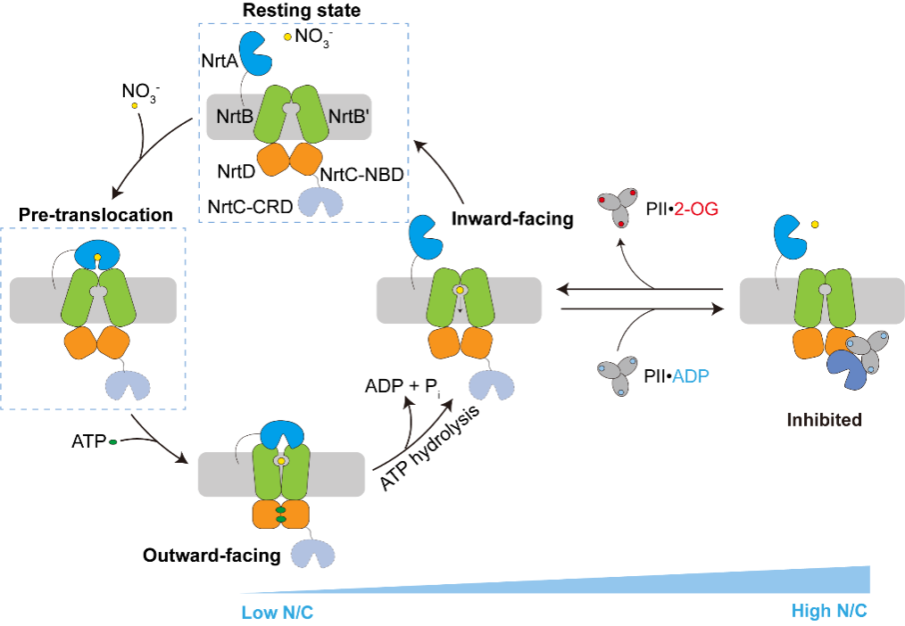 碳氮代谢平衡是细胞正常生长和处于稳态的前提。蓝细菌作为一种古老的光合自养型原核生物,进化出由多种转录因子和信号蛋白调控的碳氮代谢网络。其中,作为目前分布最广泛的蛋白家族之一,信号转导蛋白PII响应细胞内代谢小分子和能量的变化,进而调控多种靶蛋白的活性,维持碳氮平衡。在铵盐缺乏的情况下,蓝细菌通过激活硝酸盐同化通路将硝酸盐/亚硝酸盐转运到细胞内并还原为铵,从而为其生长提供氮源。研究表明,PII能与硝酸盐/亚硝酸盐转运蛋白NRT互作进而调控硝酸盐同化通路的活性。NRT由5个蛋白亚基组成:一个底物结合蛋白(SBP)NrtA、两个相同的跨膜亚基(TMD)NrtB以及两个不同的核苷酸结合亚基(NBD)NrtC和NrtD,属于ABC转运蛋白家族的I型ABC importer。与经典ABC转运蛋白不同,其NrtC亚基的C端融合了一个与NrtA相似的调控结构域(CRD),被认为可能参与调控NRT的活性。目前,关于这种新型ABC转运蛋白的结构和转运机理,以及PII如何识别NRT进而调控蓝细菌碳氮平衡的分子机理仍不清楚。