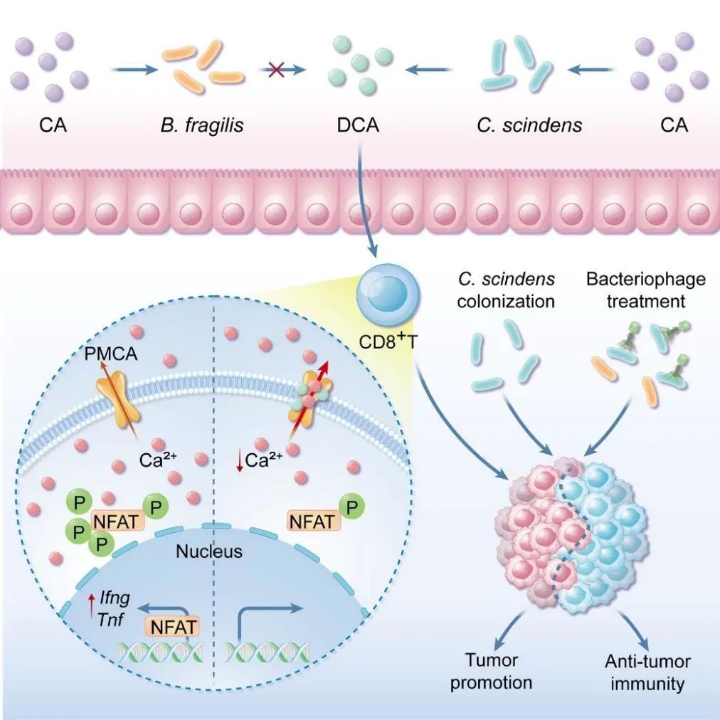 为寻找调控CD8+ T细胞抗肿瘤功能细菌/代谢物,研究团队构建了肠道微生物来源的小分子代谢物库,通过体外筛选和体内验证,发现C. scindens通过bai operon产生的次级胆汁酸脱氧胆酸(DCA)可以有效抑制CD8+ T细胞的效应功能,并促进结直肠癌生长。进一步研究发现,DCA可能是与细胞膜钙泵PMCA结合,增强其活性,从而促进其介导的Ca2+外排,导致了胞浆内Ca2+浓度降低,抑制NFAT2激活,进而削弱CD8+ T细胞的效应功能。阻断细菌DCA生物合成通路,可有效抑制细菌对CD8+ T细胞效应功能的抑制,从而阻断DCA对小鼠肿瘤生长的影响。特异性靶向裂解C. scindens的噬菌体,可有效抑制C. scindens的免疫抑制以及促肿瘤效应。这项研究揭示了肠道微生态环境与肿瘤免疫微环境互作的新通路,为解除特定微生物带来的对于免疫细胞的抑制进而对特定结直肠癌患病风险人群的预防、特定结直肠癌患者的免疫治疗及术后复发的控制皆有潜在意义。