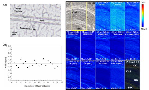 图2.(A)激光烧蚀鼠脑组织后产生的痕迹;(B)激光烧蚀组织后产生线宽的散点图;(C-P)小鼠海马组织光学图及代表性化合物成像图。