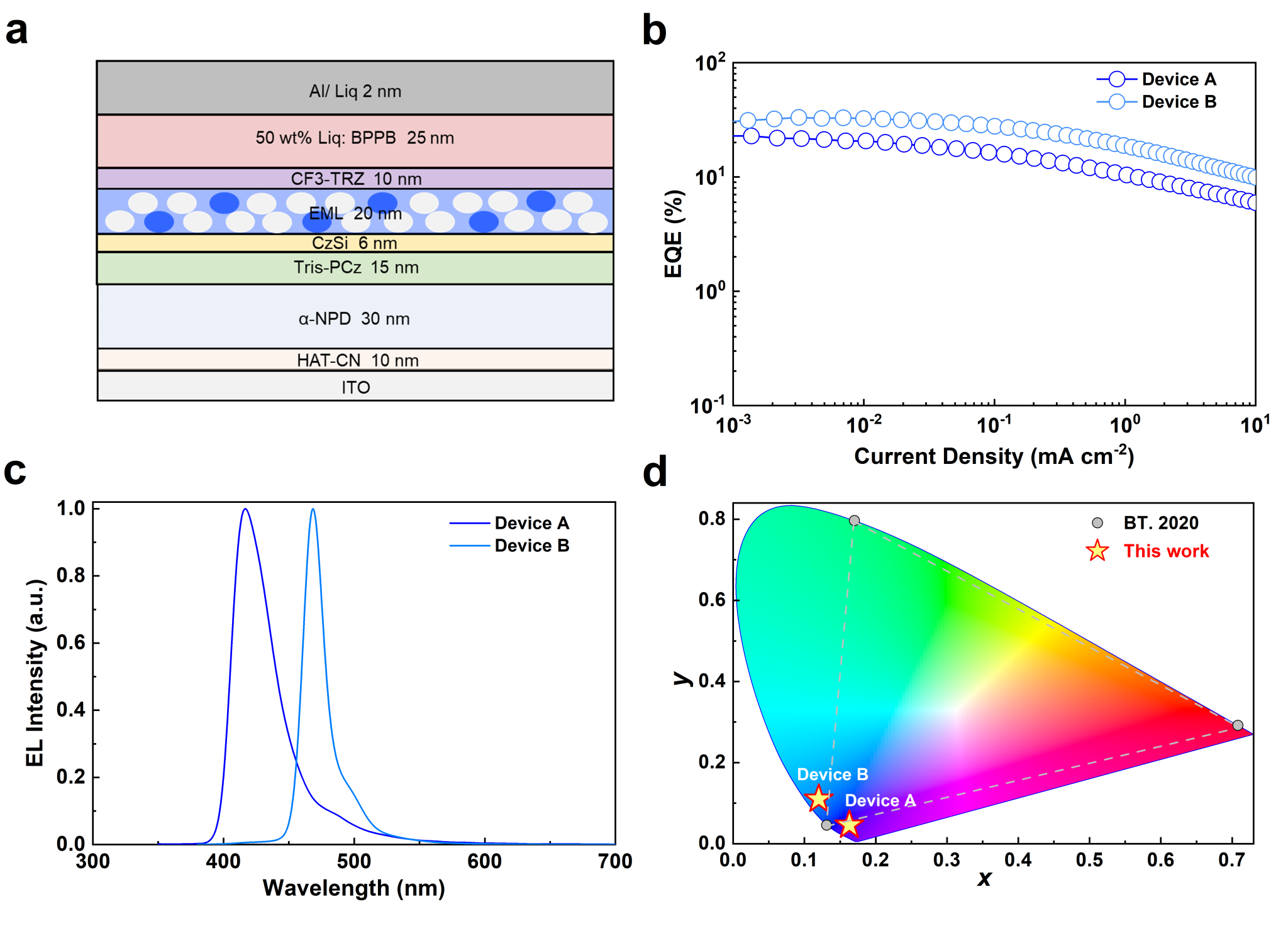 最终,基于5Cz-BO分子制备的OLED器件实现了22.8%的最大外量子效率,其CIE值为(0.163, 0.046),CIEy值已非常接近目前的BT.2020蓝光标准,从而在效率和色纯度方面实现了深蓝光OLED器件的新突破。同时,由于5Cz-BO具有较高的反向系间窜跃速率,可以作为敏化剂使用,最终敏化器件的最大外量子效率高达33.1%,使深蓝光敏化器件表现出了巨大的发展潜力(见图四)。