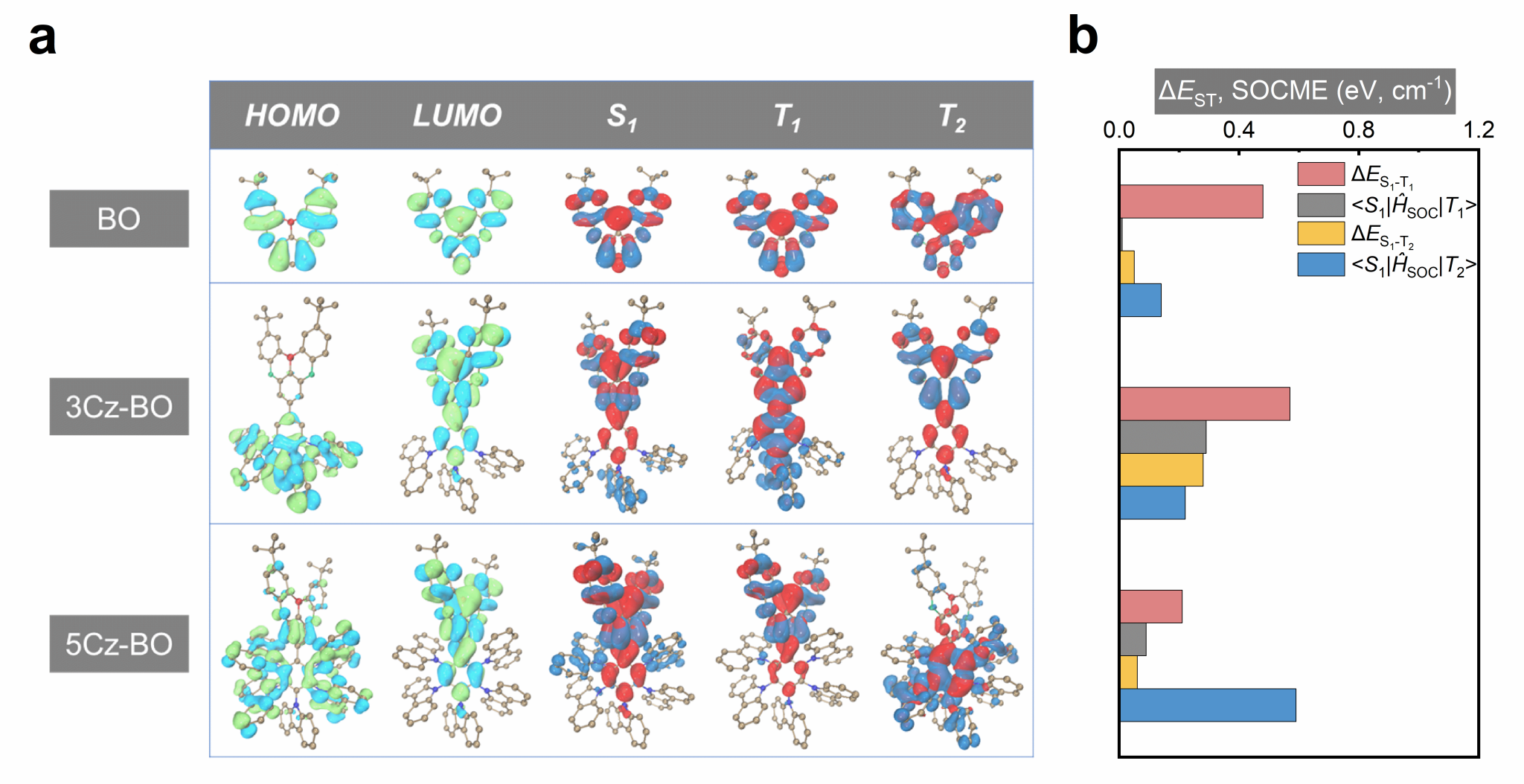 研究团队创新性地提出了高色纯度深蓝色OLED材料设计新策略,即将多个咔唑给体基团引入到多重共振(MR)型电子受体单元中,形成杂化的长程和短程电荷转移激发态。基于此策略设计的蓝光分子不仅具有短程电荷转移激发态窄谱带发射的特征,而且引入的长程电荷转移激发态有利于降低分子的单/三线态能级差,从而大幅提升分子的反向系间窜跃速率(见图一)。