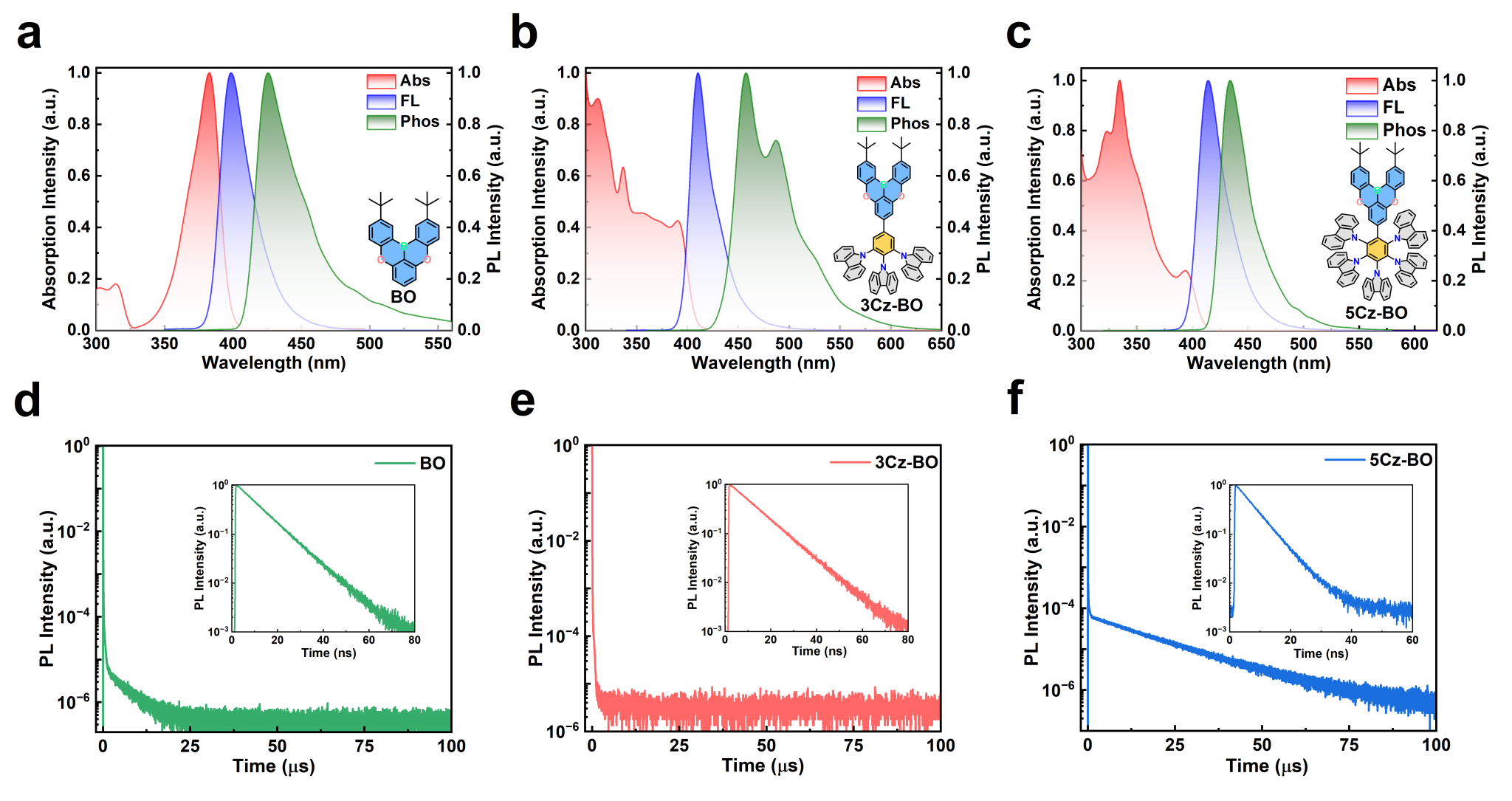 图一:深蓝光TADF分子的稳态和瞬态发射光谱