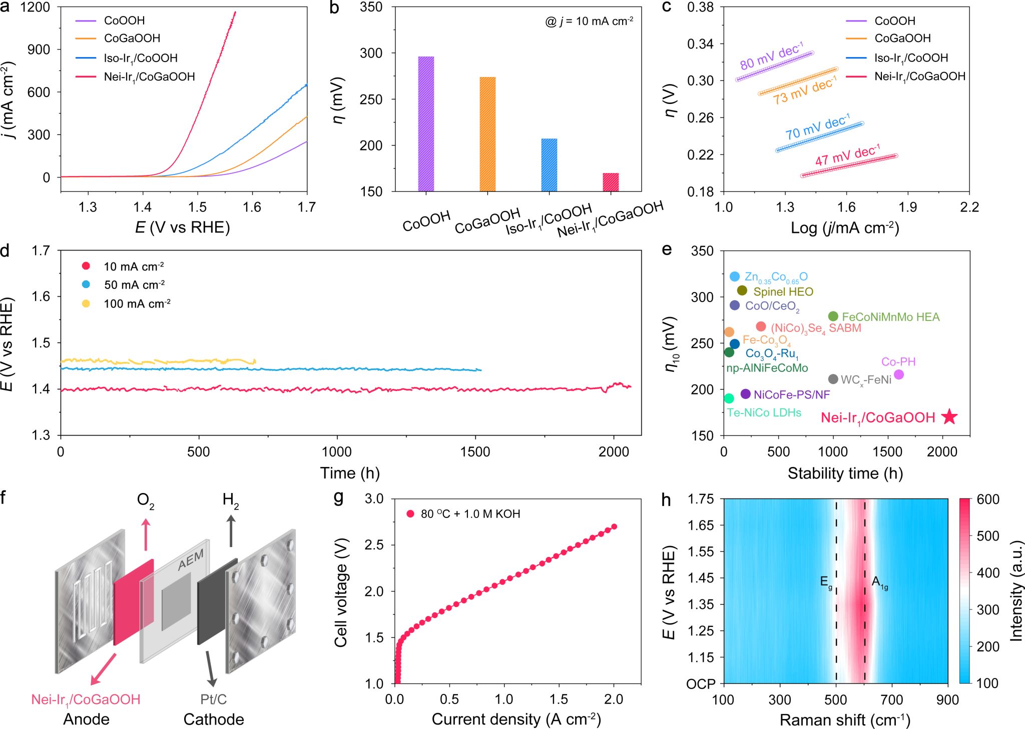 为了探究高密度单原子的近邻协同效应,研究人员评估了系列催化剂的析氧反应性能。结果表明,高密度铱单原子催化剂Nei-Ir1/CoGaOOH达到10 mA cm?2电流密度时所需的过电位仅为170 mV,并且展现出超过2000 h(约83天)的稳定性(图3a-e)。此外,催化剂在碱性水电解槽中以1 A cm?2的电流密度稳定运行超过50小时(图3f-g)。原位电化学拉曼光谱也证实催化剂在析氧反应过程中保持结构稳定(图3h)。
