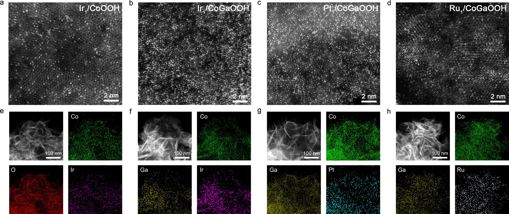 基于此,研究人员结合理论模拟和实验验证,通过向钴基氧化物晶格中引入Ga原子的策略,调控了单原子锚定位点(氧缺陷位)的电子结构,显著增强了氧缺陷位和单原子前驱体之间的结合强度,成功地构造了一系列高密度单原子催化剂(图2)。