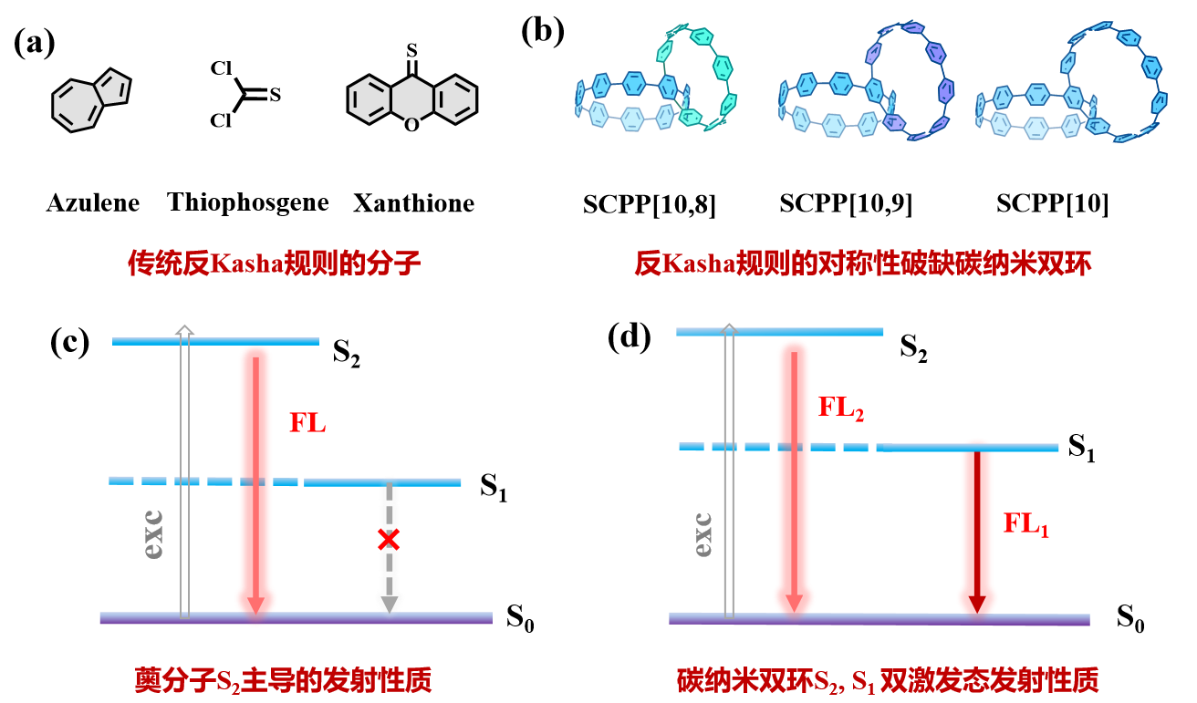 图1.(a)传统反Kasha规则的分子;(b)反Kasha规则的对称性破缺碳纳米双环分子;(c) 薁的发射特性;(d) 碳纳米双环的发射特性。