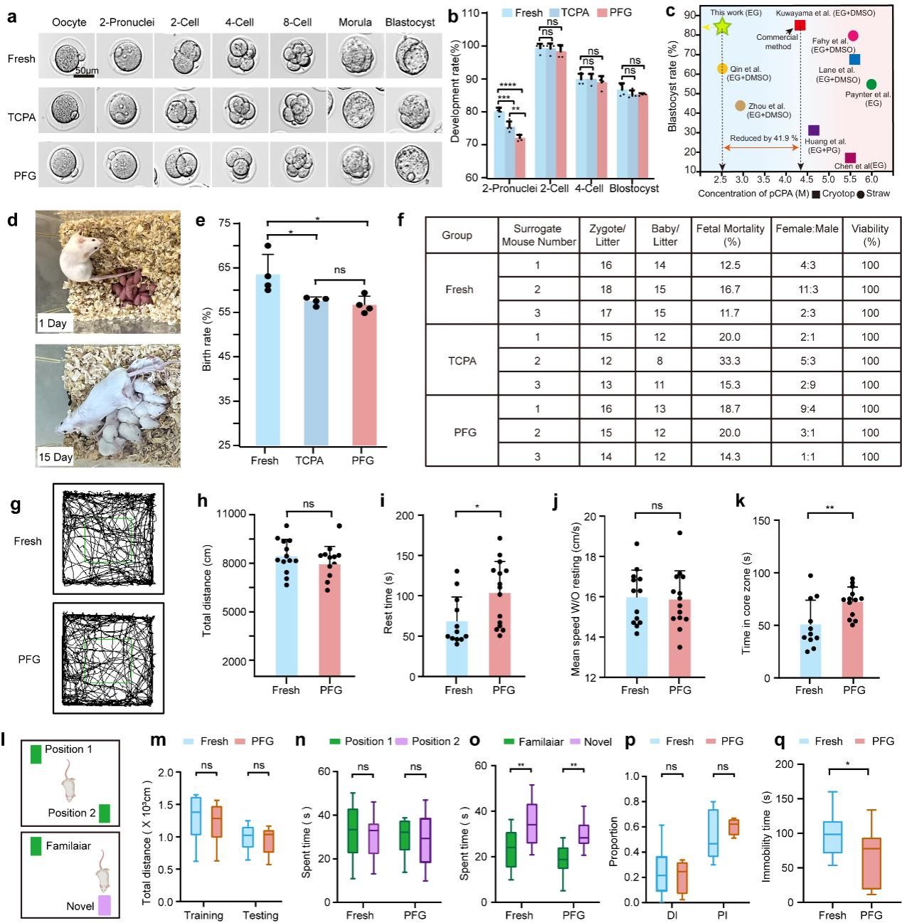 图2.小鼠成熟卵细胞低温保存后发育潜能及子代小鼠的行为学评估