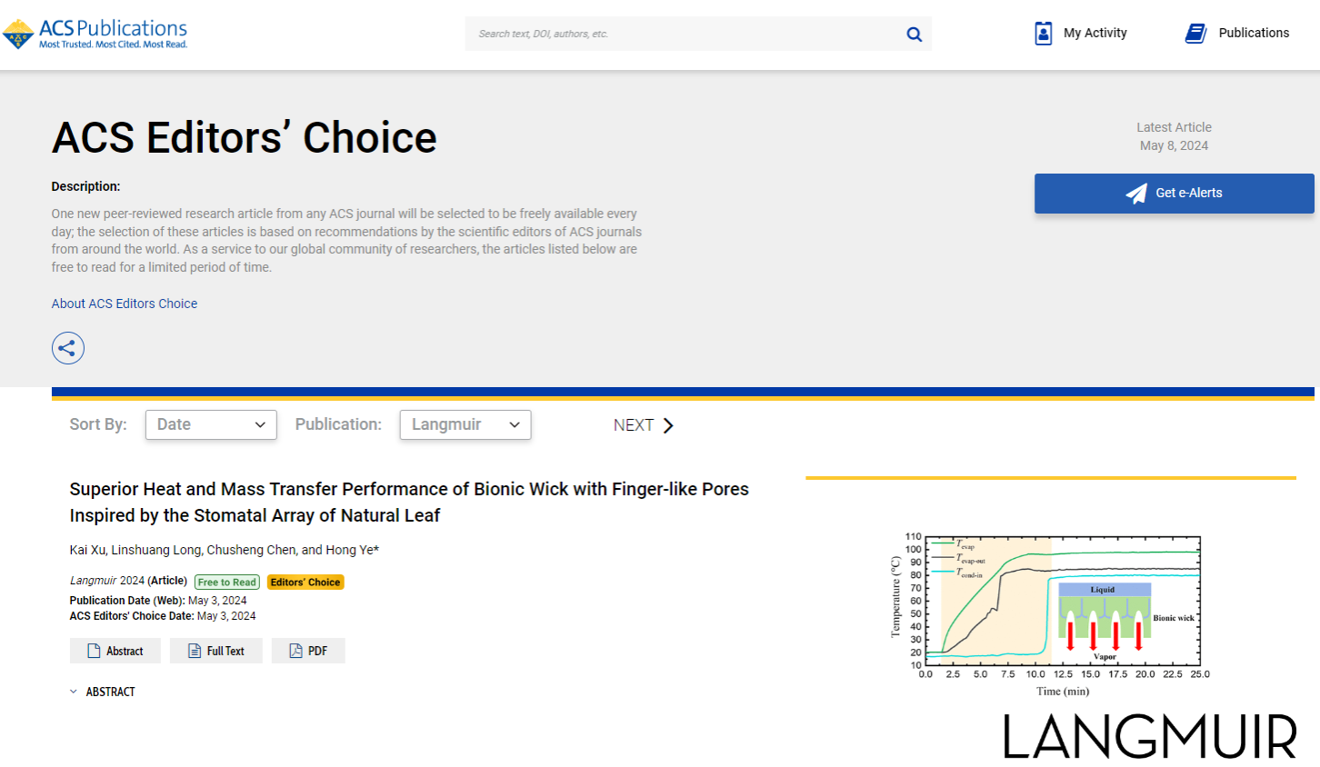近日,中国科学技术大学工程科学学院叶宏教授课题组在高效散热技术领域取得新进展,相关研究成果以“Superior heat and mass transfer performance of bionic wick with finger-like pores inspired by stomatal array of natural leaf”为题于5月在《Langmuir》在线发表。该成果被美国化学会(ACS)选为Editors' Choice亮点文章,并作为头条新闻在其网站上报道。ACS Editors' Choice是由ACS期刊编辑从每年发表的约44000篇文章中选出的365篇具有重要影响力的论文作为每日推荐,其入选率低于1%。