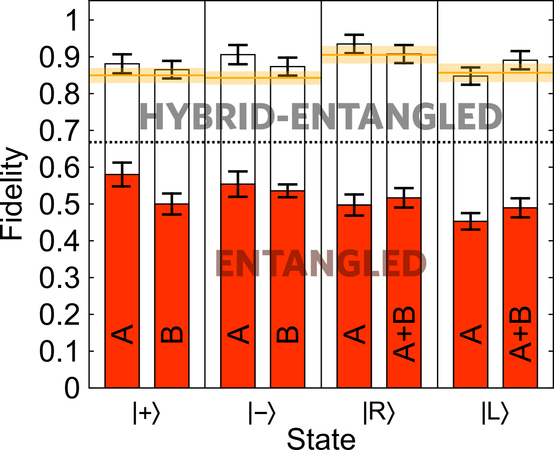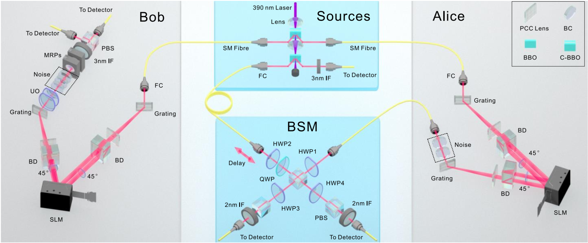 研究团队首先证明了,通过对单量子系统的环境进行特定相位调制,可以完全逆转开放量子系统演化中的相位退相干,并且该方法可以被推广到任意多体系统中。然后以光子的偏振作为量子系统,光子的频率作为噪声环境进行实验。基于完全可控相位退相干量子模拟器,在环境中加载特定相位调制,从而制备出双光子偏振-频率混合纠缠初态,然后把两个光子分发给用户Alice和Bob。Alice端进行退相干演化,再与待传递的量子态做贝尔测量,接着在Bob端进行退相干演化,最终通过经典通信对得到的量子比特做相应幺正操作得到被传递的量子态(图1和图2),测得的保真度接近90%(图3)。由于此过程中双光子的偏振态从未违背贝尔不等式,本实验是基于隐藏量子非局域性实现了量子隐形传态。总之,本成果提供了一种区别于动力学解耦(Dynamical Decoupling)和无退相干子空间(Decoherence-Free Subspaces)的克服环境噪声的新方法,并对深入理解量子非局域性有重要意义。