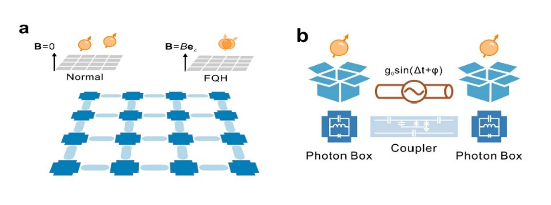图1:成果示意图。16个非线性“光子盒”阵列囚禁的微波光子强相互作用形成分数量子反常霍尔态(注:“光子盒”的名字最早来自1930年爱因斯坦和波尔争论中提出的思想实验)。