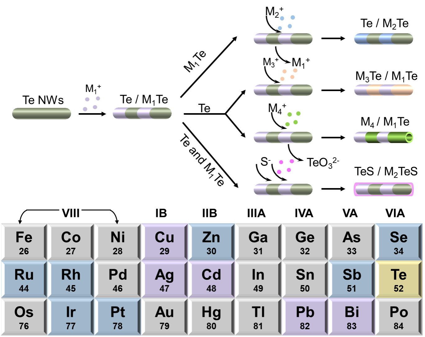 图2.碲化物一维分段异质纳米结构的化学后转化途径及材料库。