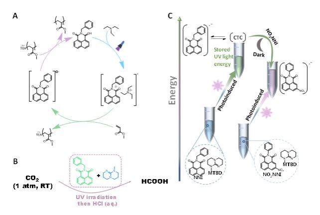 课题组将该体系成功应用于丙烯酸酯类单体的光诱导聚合,二氧化碳的光还原,以及光能存储及释放方面,通过在黑暗条件下将光照时储存的光能释放,使得原本需要光照才能进行的过程在黑暗条件下也能进行(图3)。根据作者推测,通过电子激发态形成溶液中稳定的基态复合物这种分子间相互作用模式不应该仅局限于酰亚胺和胺分子之间,很有可能是一种比较普遍但是未被关注的相互作用,有望在更多的分子结构中被发现并且能够用于新的光化学反应。
