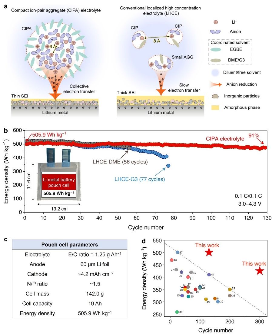 近日,中国科学技术大学化学与材料科学学院焦淑红教授团队,联合北京大学徐东升教授、中国科学院物理研究所王雪锋研究员和苏州大学程涛教授团队,在高能量锂金属电池领域取得突破性进展。研究人员通过调控电解液在介观尺度下的锂离子溶剂化结构,设计了一种紧密离子对聚集体(CIPA)电解液,从而实现了500Wh?kg?1锂金属电池的稳定运行。相关成果以“Towards long-life 500?Wh?kg?1lithium metal pouch cells via compact ion-pair aggregate electrolytes”为题,于7月8日发表在Nature Energy杂志上。