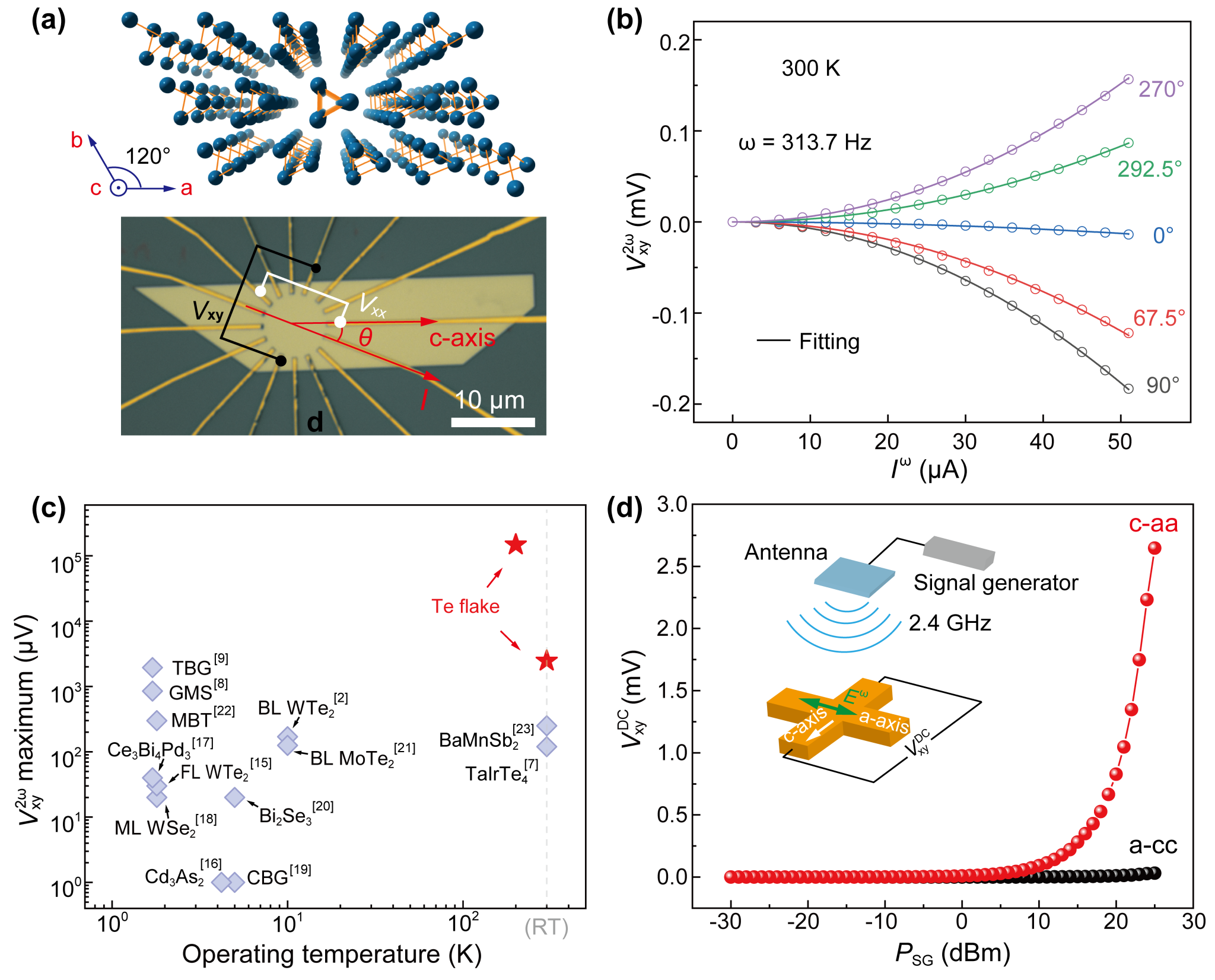 图:(a)碲的晶体结构示意图及基于碲薄片的测试器件。(b)不同电流方向下非线性霍尔电压随交流电流的变化关系。(c)非线性霍尔电压输出幅值及工作温度与其他体系的对比。(d)基于非线性霍尔的无线射频整流效应。