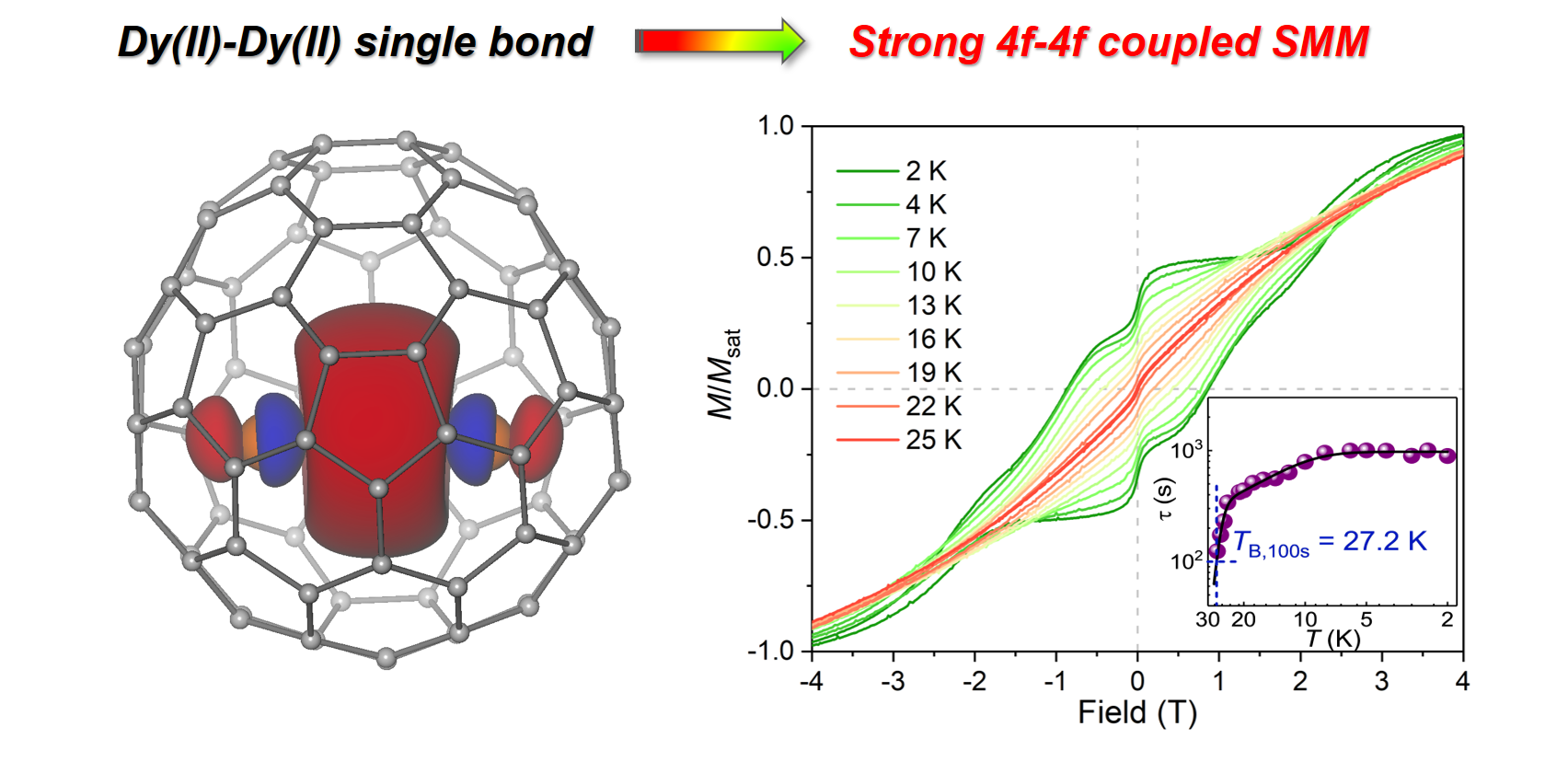 由全碳原子组成的封闭笼状富勒烯分子,为稳定上述特殊的镧系金属共价键提供了可能,所得到的内嵌金属富勒烯SMM具有化学和热稳定性高、可升华、分子和电子结构易于调控等特点。鉴于此,杨上峰教授团队通过真空电弧放电法合成了首例含有Dy-Dy共价键(键长仅为3.61 ?)的双金属富勒烯Dy2@C82。这一特殊成键性质导致两个Dy离子之间产生很强的反铁磁耦合作用(磁交换能垒为33.9 K),从而有效抑制了量子隧穿效应。Dy2@C82在25 K以下均能展现出SMM特征的磁滞现象,其弛豫时间100秒时对应的阻塞温度(TB,100s)达27.2K,为目前报道的所有通过4f电子直接耦合(不含单电子金属-金属键)的多核单分子磁体中的最高值。这一发现不仅展示了内嵌金属富勒烯在单分子磁体领域的优势,也为研究镧系金属的特殊成键性质提供了重要的科学模型。