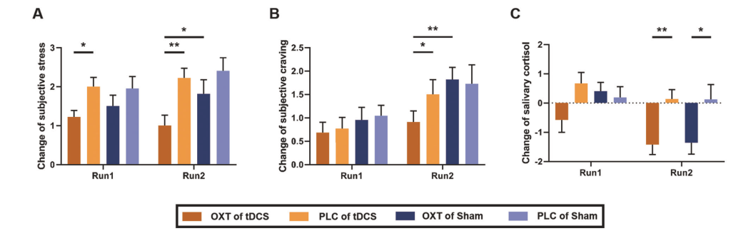 为了进一步探索恢复吸烟者对应激反应敏感性的方法,研究团队采用了tDCS技术,对吸烟者的大脑右侧颞上回前部(anterior rSTG)进行了阳极刺激。结果显示,经过tDCS刺激的吸烟者,在催产素作用下,其主观应激评分和唾液皮质醇水平显著降低,表明tDCS可能恢复了吸烟者对催产素应激缓解作用的敏感性。