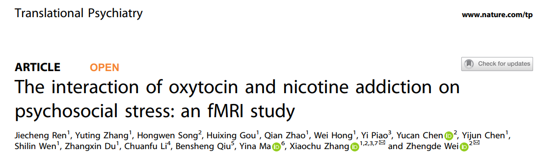 8月30日,国际精神病学权威期刊Translational Psychiatry在线发表了中国科学技术大学心理学系韦正德特任副研究员和张效初教授合作的题为“The interaction of oxytocin and nicotine addiction on psychosocial stress: an fMRI study”的文章。该研究揭示了催产素(OXT)在缓解心理应激方面的复杂作用,特别是针对吸烟者的效果减弱现象,并探索了通过经颅直流电刺激(tDCS)恢复其有效性的新方法。
