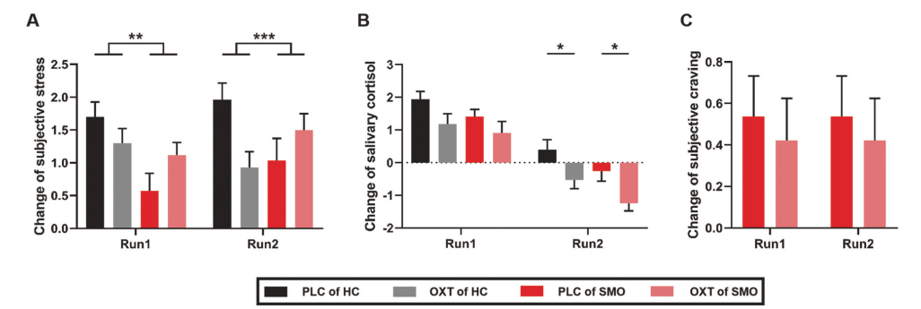 研究团队招募了包括健康对照者和吸烟者在内的参与者,通过功能性磁共振成像(fMRI)和tDCS技术,评估了催产素在心理应激任务中的影响。实验结果显示,在健康对照组中,催产素显著降低了主观应激评分和唾液皮质醇水平,但在吸烟者中,这种效果并不明显。