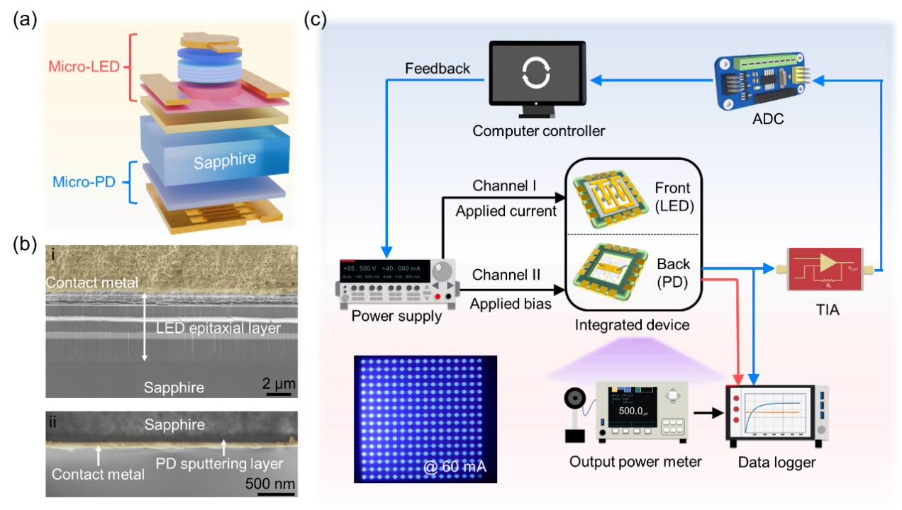 图1.(a)深紫外micro-LED与光电探测器(PD)三维垂直集成芯片架构。(b)深紫外LED外延层与薄膜光电探测器截面的扫描电子显微镜图像。(c)基于双面垂直集成器件搭建的具有自校准、自监测功能的稳定发光系统示意图