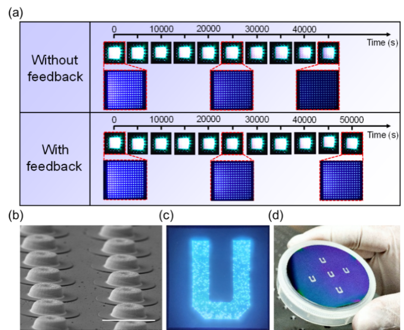 图2.(a)无反馈信号与加入反馈信号的深紫外micro-LED阵列随时间变化的发光照片。(b)制备的micro-LED阵列的倾斜扫描电子显微图像。(c)显示“U”的深紫外micro-LED阵列光学图像。(d)经过显影后,硅衬底上光刻胶(SPR955)的光学图像。