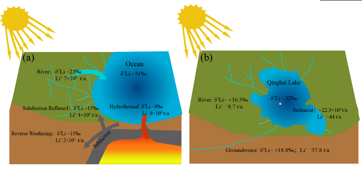 图3.(a)(b)分别是海洋(Misra and Froelich., 2012)和青海湖的Li循环模式示意图。