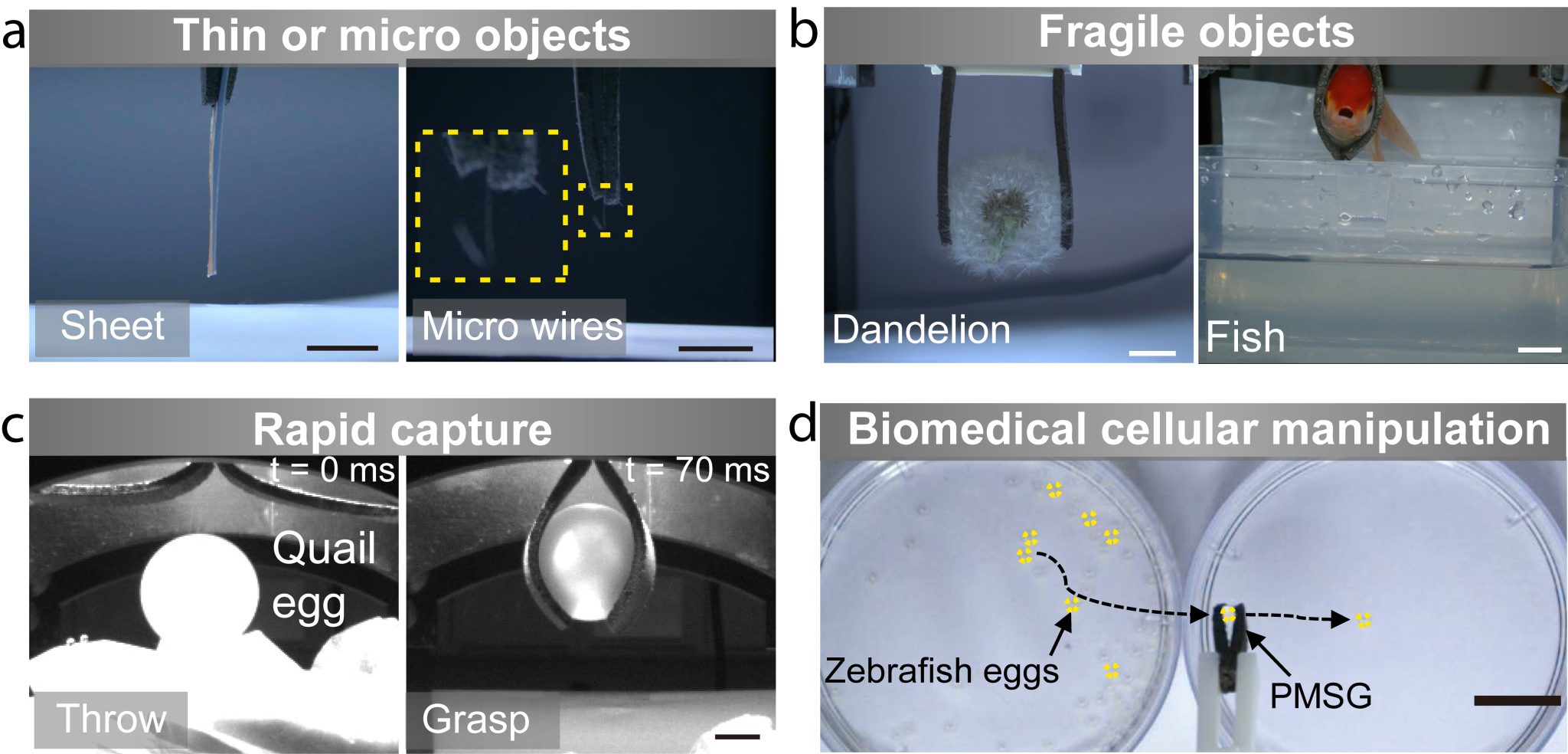 图2.软体抓手的多功能性展示(a)抓取薄板和细线(b)抓取鱼和蒲公英(c)快速抓取去壳生蛋(d)安全移取斑马鱼卵