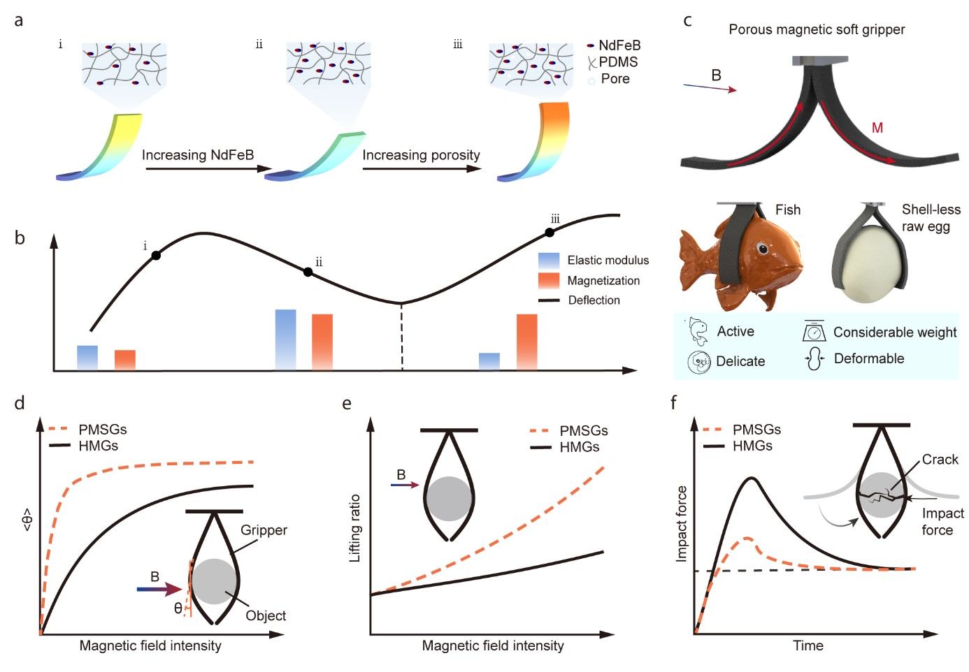 磁性软体抓手因其操作灵活、反应迅速,并且对生物体安全而备受瞩目。它们特别适合用来精细地处理那些脆弱的生物体。然而,如何在操作过程中不伤害这些生物体,一直是科研人员面临的一个挑战。针对上述挑战,研究团队提出通过将多孔结构引入磁性硅胶弹性体制造PMSG的方法,使其具备高磁化、低模量和粗糙表面特点,从而展现卓越的柔软度和适形性,同时在快速抓取时减少对物体的冲击。这种简单有效的方法为高性能致动器与生物的安全交互提供了全新的思路。