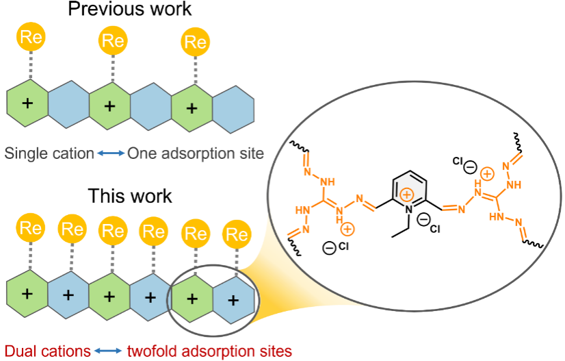为此,核科学技术学院辐射防护课题组陈志副教授团队利用双阳离子策略通过两步法成功构建了具有高电荷密度和丰富活性位点的双阳离子共价有机聚合物(DCOP)材料。光谱表征结合理论计算的结果显示,DCOP呈现片状结构,具有优越的多孔性和一定的热稳定性能,这是利于99TcO4-的去除。利用非放射性的ReO4-模拟研究,批量实验结果表明,DCOP对ReO4-具有超快的去除动力学(30 s内R> 99%)、高去除容量(708.9 mg/g)、高选择性(在NO3-和SO42-超过1000倍时R分别为77.5%和85.5%)、优异的稳定性(在1M HNO3, 1M NaOH, 240 kGy γ辐射等极端条件下)、良好的可回收性(6次)和高应用潜力(模拟Hanford废液中R为90.7%)。本研究显示了双阳离子共价有机聚合物在提高核废水中99TcO4-/ReO4-去除效率方面的巨大潜力,为设计核废水处理的高性能COP材料提供了新的有价值的策略。相关成果近日以“Dual-cation covalent organic polymers with sufficient adsorption sites for enhancing99TcO4-/ReO4-removal”和“Polymer microspheres functionalized with a trialkylamine containing unequal alkyl chains as an anion exchange resin for efficient removal of ReO4-as a surrogate for99TcO4-”为题分别发表于国际知名期刊《Chemical Engineering Journal》和《Journal of Environmental Chemical Engineering》。这是自今年2月该课题组以“Synthesis and performance of guanidinium-based cationic organic polymer for the efficient removal of TcO4-/ReO4-”为题发表在国际知名期刊《Journal of Hazardous Materials》上以来,又一次取得的系列重要进展。