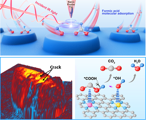 研究团队依托合肥国家同步辐射实验室自由电子激光原子力显微-红外光谱(AFM-IRFEL)实验站对Ir-Co双位点协同催化甲酸氧化反应进行了深入研究。AFM-IR联用AFM和IR光谱技术,同时获得样品局域结构和化学指纹信息,最佳空间分辨率优于10 nm。结合共振增强技术,进一步提高检测灵敏度,从而实现单分子层样品的高灵敏度探测。研究团队发现Ir-Co催化剂中C-O信号和O-H信号在空间上高度重叠,为协同催化的实现提供直观可视化证据。此外,红外光谱中 C-O 信号的峰位偏移为反应物种间的协同作用提供了有力的谱学证据。高空间分辨成像结果揭示了反应物种在催化剂表面裂缝处的集中分布,裂缝区域表现出显著的活性。这些区域的独特结构,如悬挂键和缺陷是其高催化活性的主要来源。材料表面成像差异反映了位置相关的催化反应活性,为化学反应路径和催化活性的调控提供了重要的科学指导。