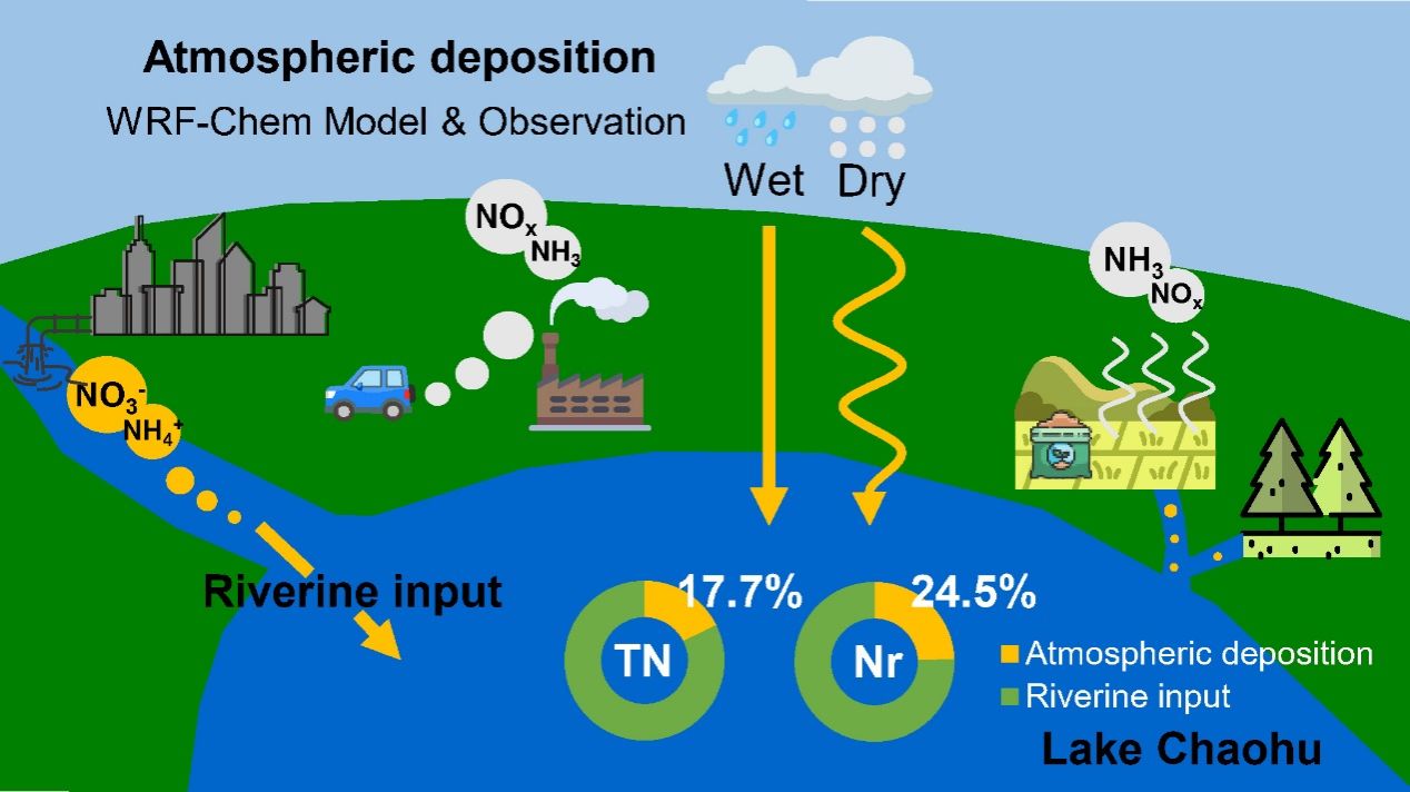 N、P等营养元素的来源和转化利用机制是影响湖体水质和藻华爆发的重要因素。长期以来,巢湖N来源的监测一直关注在径流输送上。传统观点认为,地表河流输送是主要来源,忽略了对大气沉降贡献的评估,这主要受限于大气沉降监测技术和沉降通量量化评估手段的不足。为了定量评估大气沉降对巢湖N收支的影响,中国科学技术大学地球和空间科学学院耿雷、刘晓东教授团队与广州地化所王新明研究员团队以及安徽省巢湖管理局合作,利用大气化学传输模式结合大气N沉降观测数据,系统评估了巢湖氮负荷的多来源贡献。结果显示,在2022年,大气总氮沉降量约占巢湖年总氮输入量的18%,而对于能直接被生物吸收利用的活性氮成分,大气沉降的年总贡献可达约25%,而在旱季与某些月份该贡献甚至超过了50%。