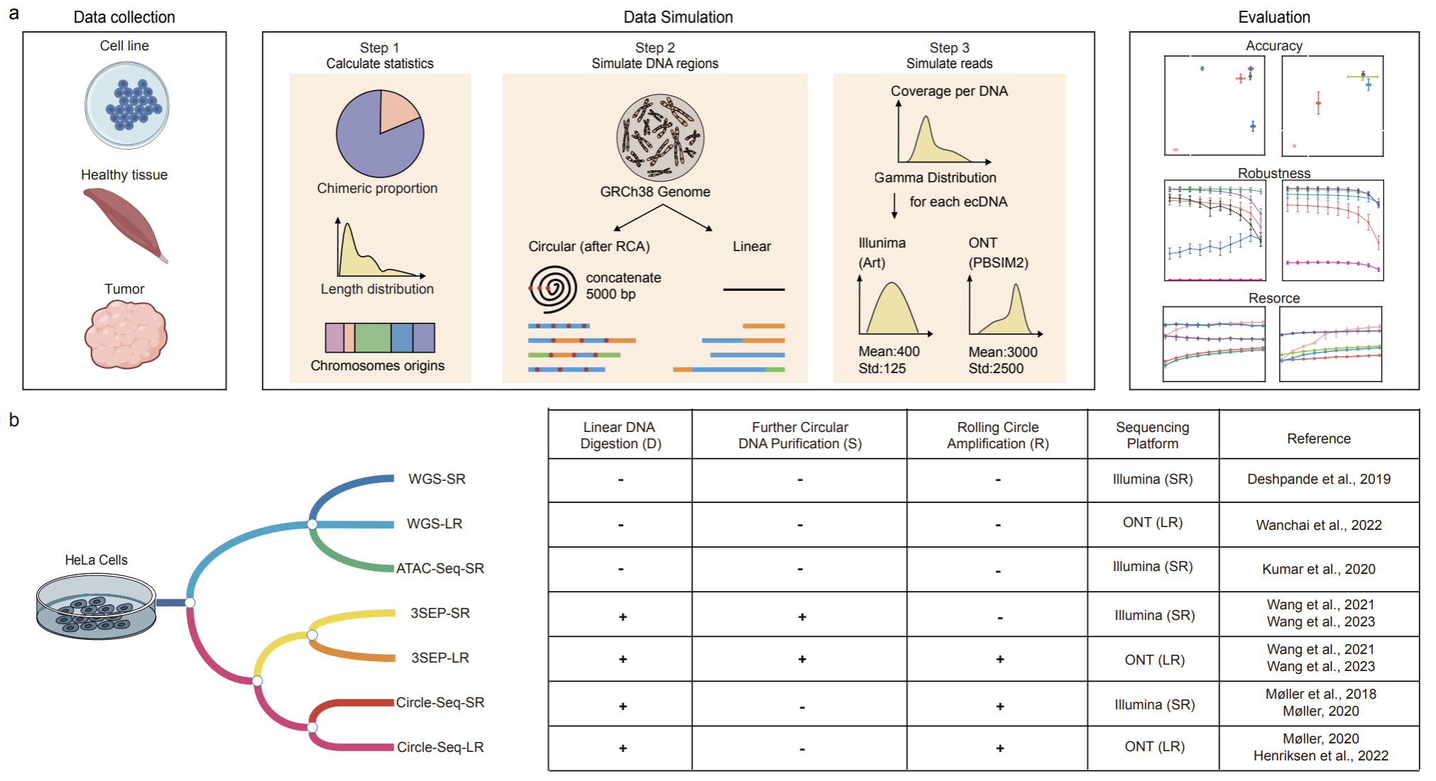 图:eccDNA鉴定的分析算法和实验方法系统性比较工作流程