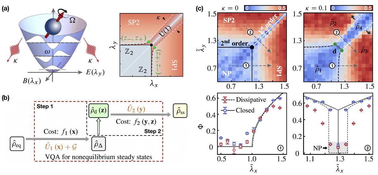 (a)具有多临界相变行为的封闭和耗散Rabi模型。(b)非平衡稳态的量子变分算法。(c)封闭和耗散Rabi模型多临界相变的实验数据。
