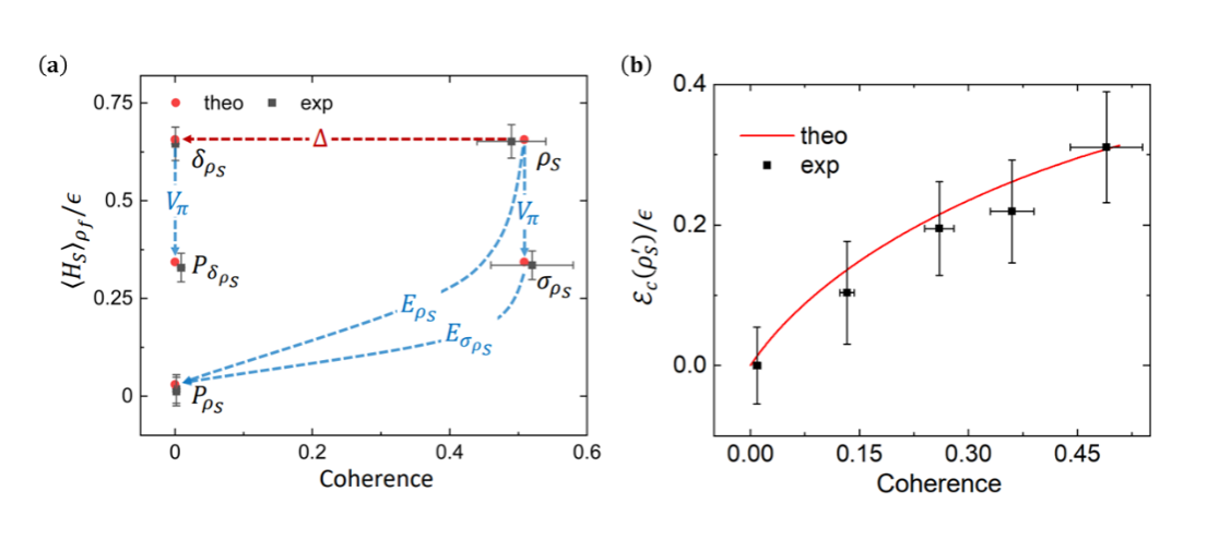 图:(a)各类功提取操作前后量子态的能量和量子相干;(b)相干最大可提取功与量子相干的关系。