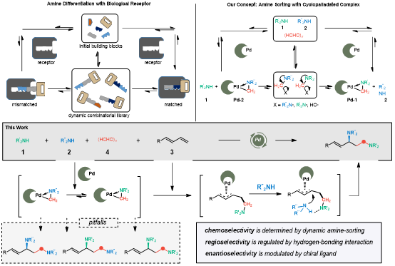 在动态组合化学(DCC)中,利用酶作为生物受体,在特殊的生物和化学体系中已经实现了脂肪胺在亚胺形式下的高选择性识别。受此启发,同时结合课题组对氮杂三元环钯络合物独特反应活性的深入理解,研究团队提出,通过不同N,O-缩醛对零价钯氧化加成所形成的环钯络合物的反应活性差异,也许能够实现对脂肪胺的高效区分。具体而言,富电子的脂肪胺由于更好的配位能力,优先和钯催化剂生成稳定的三元环钯络合物并发生胺甲基化反应,而缺电子的胺则倾向于游离在体系中发生后续的胺化反应。基于此,研究团队成功开发了一种钯催化的动态胺排序策略,从两种或多种不同的胺,共轭二烯和多聚甲醛出发,以优秀的化学、区域和对映选择性构建了一系列非对称手性1,3-二胺。