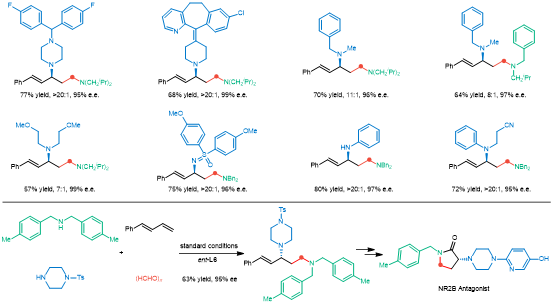 在原子或分子水平操控合成子,并高效、高选择性地将其组装成功能分子,是合成化学的终极追求之一。其中,对具有微小差异的分子同系物进行精确识别是实现上述目标的先决条件。在药物化学中,高化学和立体选择性地组装不同的胺同系物,以合成具有独特药理化学性质的非对称手性二胺,是合成化学家们长期探索的重要课题之一。然而,由于富电子的胺同系物通常具有相似的三维结构和物理化学性质,并且它们对过渡金属催化剂存在着毒化作用,这一愿景目前仍面临着巨大的挑战。迄今为止,绝大多数非对称二胺的合成仍需通过多步反应才能实现,而一步双胺化反应则仅限于引入两个相同的含氮官能团。在这一背景下,开发一种变革性的策略对胺的活性进行精准排序,以实现对胺同系物的高效识别和精准组装,显得尤为重要。