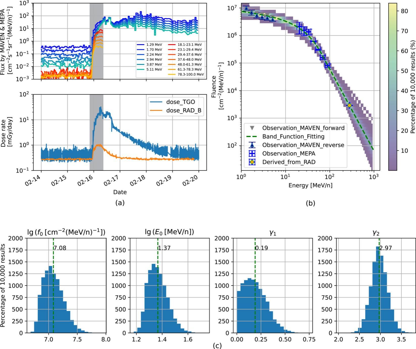 2022年2月15日的SPE是“天问一号”环绕器进入火星科学任务轨道以来,首个能够在火星表面引起辐射剂量增强的事件。此事件在火星表面引发的辐射剂量被火星表面“好奇号”火星车上搭载的辐射评估探测器(Radiation Assessment Detector,RAD)完整地记录。本研究联合利用了多个探测器数据来构建完整的SPE质子能谱:火星轨道上的高能粒子探测器MANEN/SEP和MEPA测得了中低能段的质子能谱(20-100MeV);而更高能段的质子通量是结合火星表面的“好奇号”火星车的数据和火星粒子传输模拟反演而得出。研究人员继而使用双幂律函数对上述观测和反演的能谱进行拟合,得到了此次SPE事件在火星空间的1-1000MeV之间的完整的质子能谱(图2)。研究又利用这一完整的SPE能谱计算了此次事件在火星轨道和火星表面引发的辐射剂量,得到的结果与轨道处的欧洲航天局的微量气体轨道飞行器(TGO)和火星表面的“好奇号”火星车(MSL)的实际测量值均定量相符。这一结果同时验证了MEPA数据的可靠性和火星辐射传输模型的精准性,结果可作为将来类似事件研究的比对参考。
