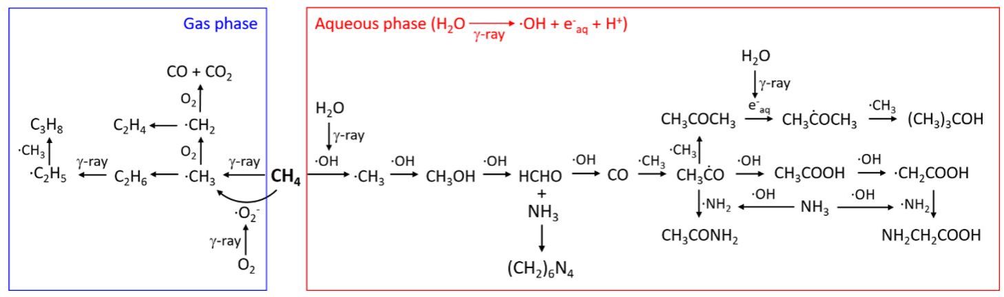 图1.伽马射线驱动水相甲烷和氨气转化为甘氨酸的示意图