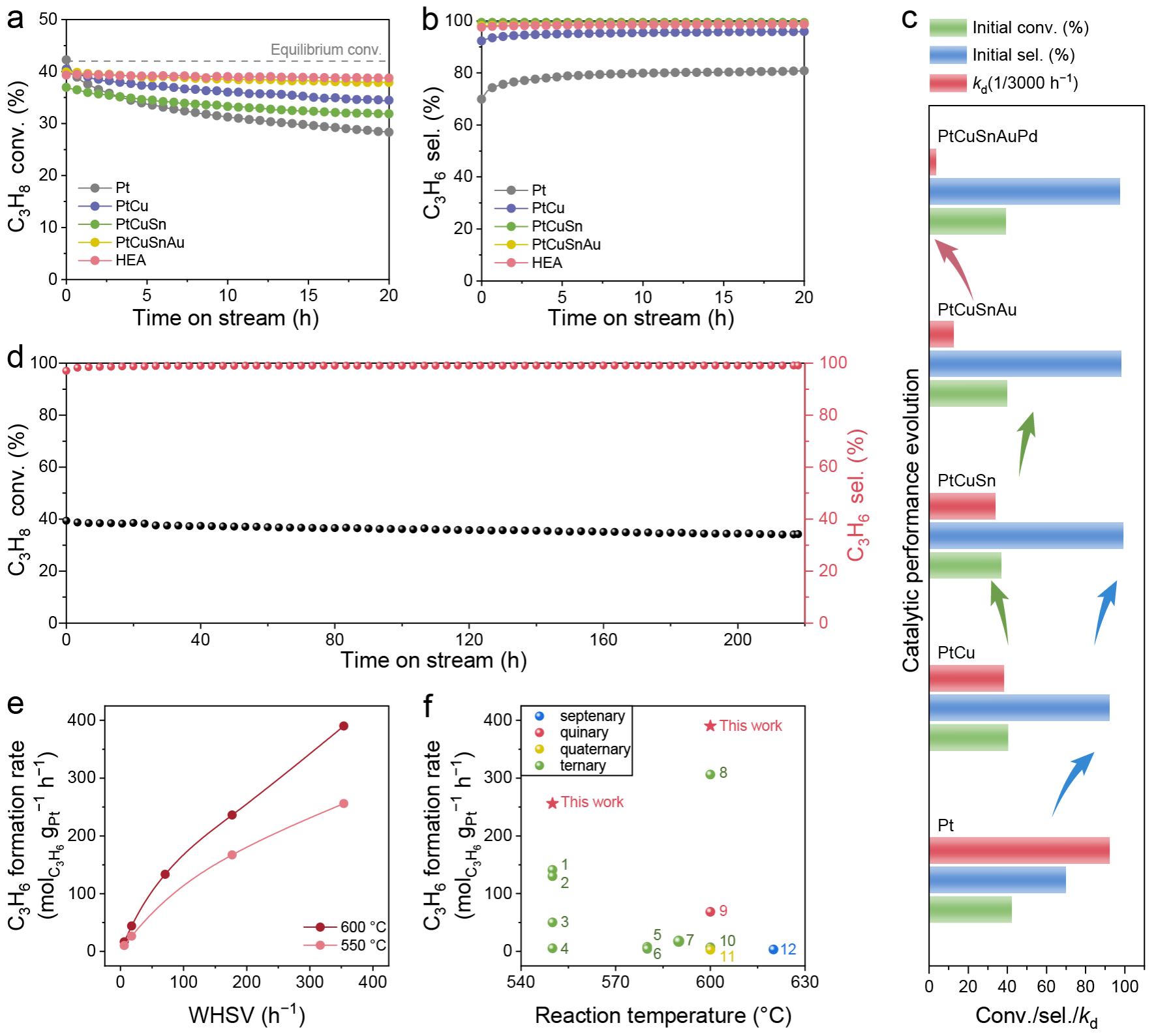催化研究表明,合金元素逐步引入带来的结构变化对应地实现了丙烷脱氢催化选择性、活性及稳定性的提升。所制备的高熵合金催化剂在550摄氏度常规测试条件下200小时内无明显失活。此外,在354每小时的高空速条件下,所制备高熵合金催化剂在550及600摄氏度下均展现出超高的丙烯生成速率,优于已报道的铂基多元合金催化剂。该工作对合金化效应的深刻理解和灵活应用实现了高熵合金催化剂的定向构筑,为高熵合金设计制备提供新思路,有望加速催化剂的开发与研究。